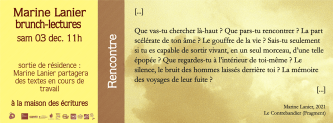 Rendez-vous à la maison des écritures, dans sa modeste "chambre d'inspiration" pour laisser votre esprit vagabonder dans ses inspirations et ses textes. On y saisit comment le regard de Marine Lanier est depuis toujours intensément nourri de littérature(s).